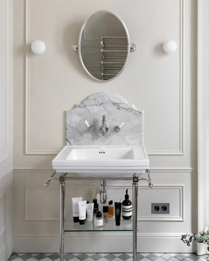 Bevar husets ånd med tidløse fliser og møbler, der fremhæver rummets klassiske charme.
